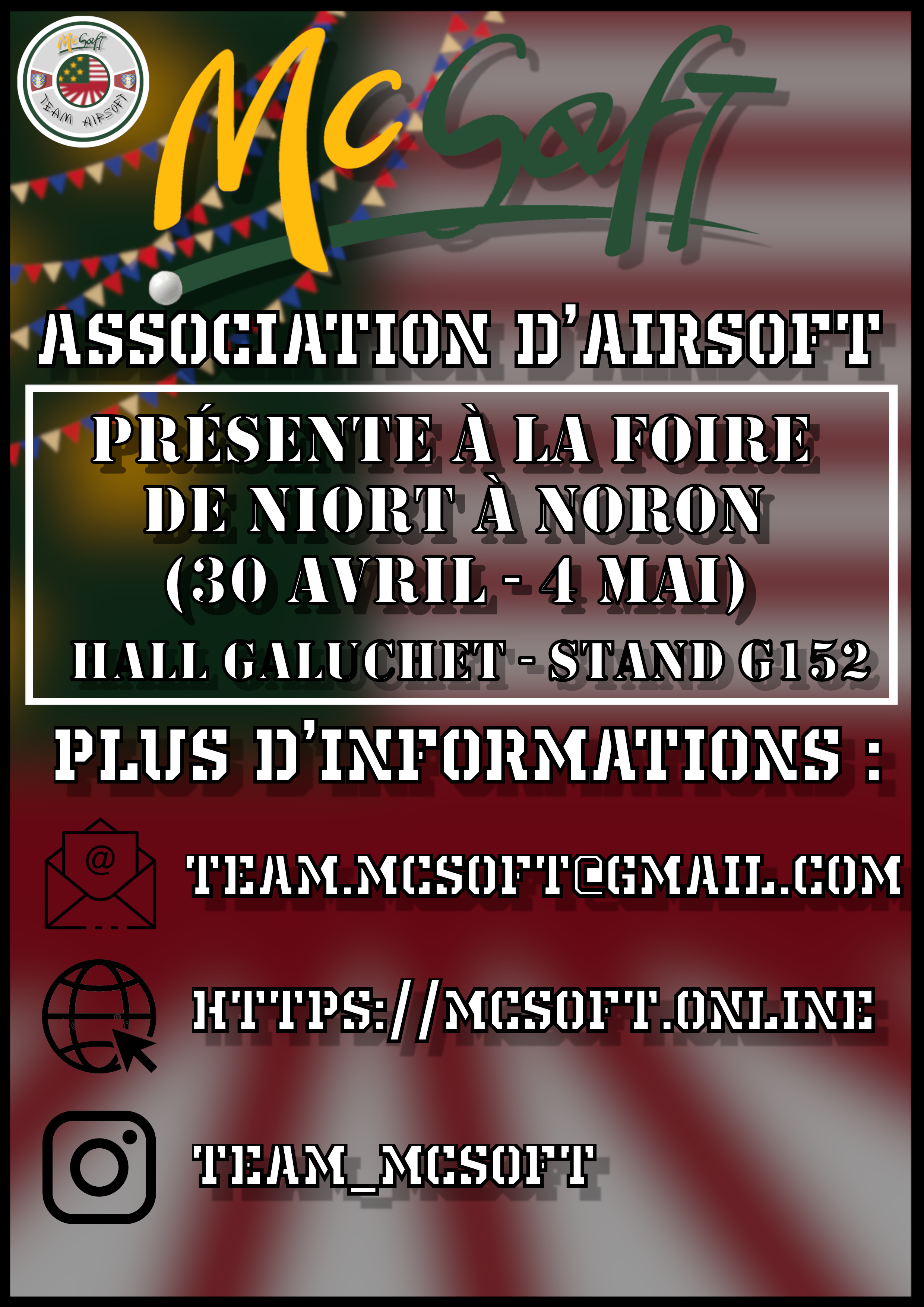 L'association McSoft sera présente pour la deuxième année consécutive à la foire de Niort 2026 ! Retrouvez nous du 30 Avril au 4 Mai au Hall Galuchet pour vous expliquer le loisir de l'Airsoft ! Stand de tir et goodies à la clé, venez essayez l'Airsoft, que vous soyez petit ou grand ! (Puissance de la réplique en fonction de l'âge du visiteur)